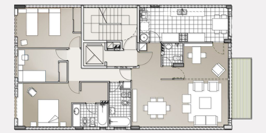 Este edificio de viviendas es el fruto de un desarrollo inmobiliario de unidades para la venta. Situado en un barrio residencial de baja densidad en Caballito. Los edificios de viviendas son parte de nuestro expertise como estudio de arquitectura y contamos con un área especializada en desarrollos inmobiliarios. Realizamos la búsqueda del terreno, estudio de alternativas según indicadores del mercado, proyecto, dirección y administración de obra.